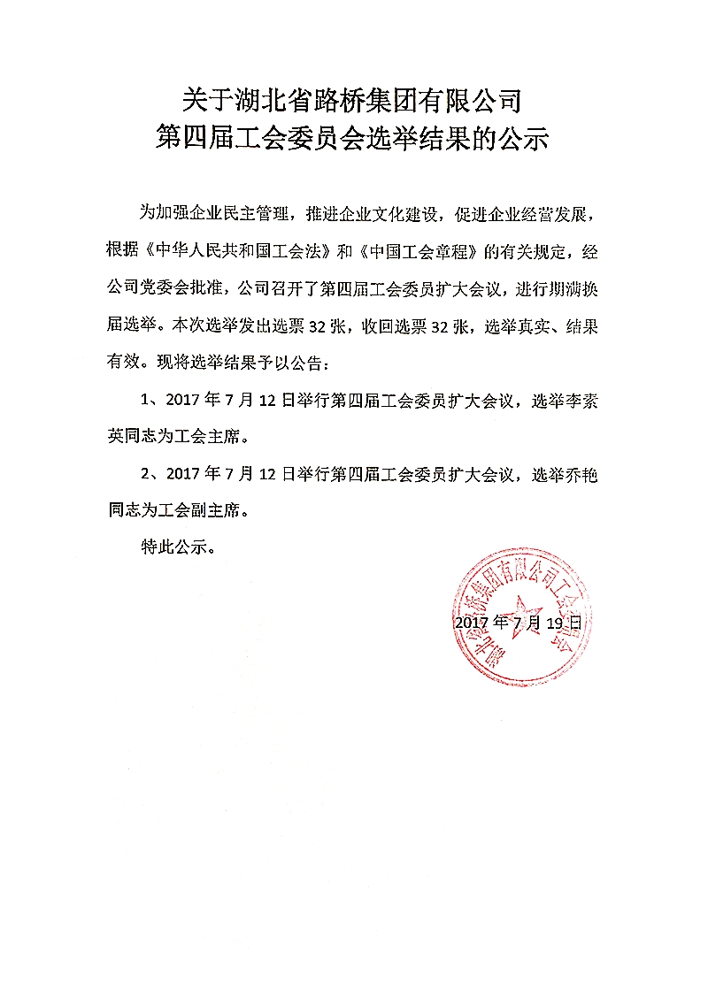 第四屆工會(huì)委員會(huì)選舉結(jié)果的公示