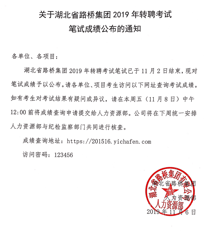 關(guān)于湖北省路橋集團(tuán)2019年轉(zhuǎn)聘考試筆試成績(jī)公布的通知