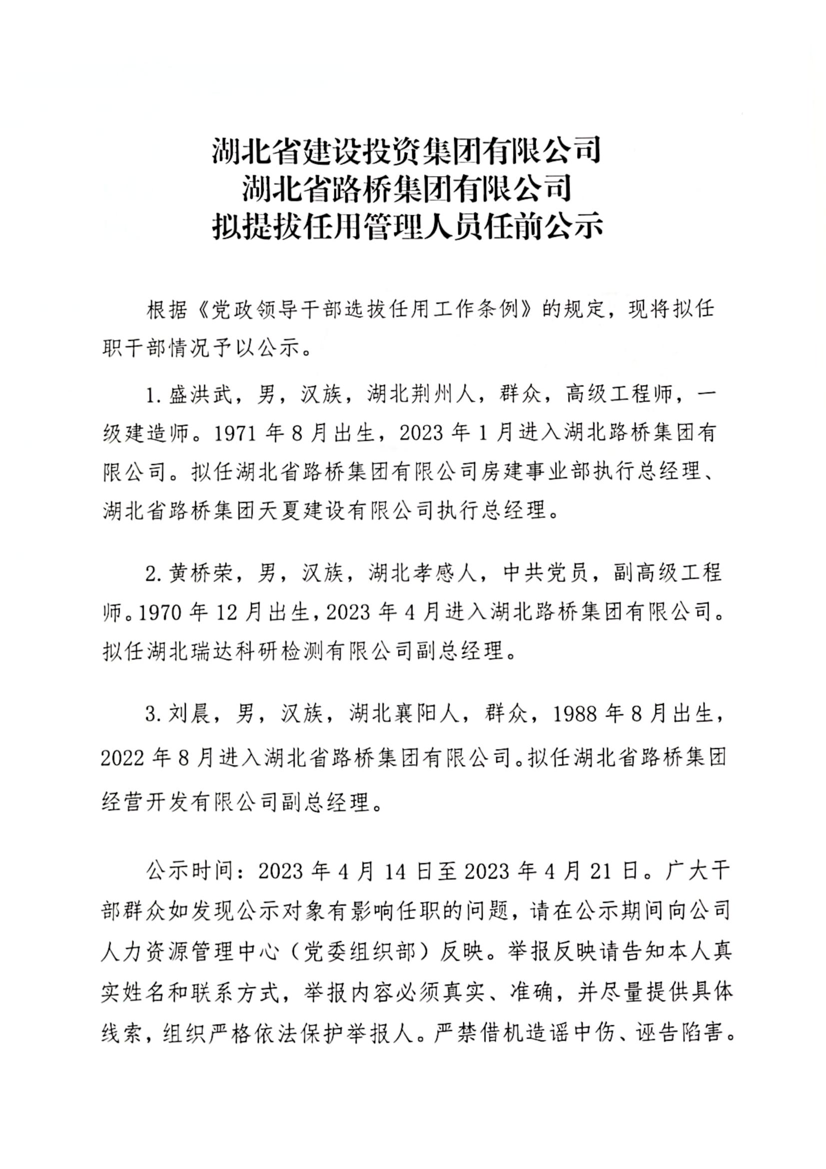 湖北省路橋集團有限公司擬提拔任用管理人員任前公示