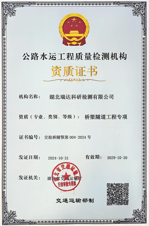 經湖北省交通運輸廳批準,湖北路橋瑞達科研檢測公司成功取得公路工程橋梁隧道工程專項資質,成為全省第5家取得該資質的檢測機構,資質實力達到了新高度。