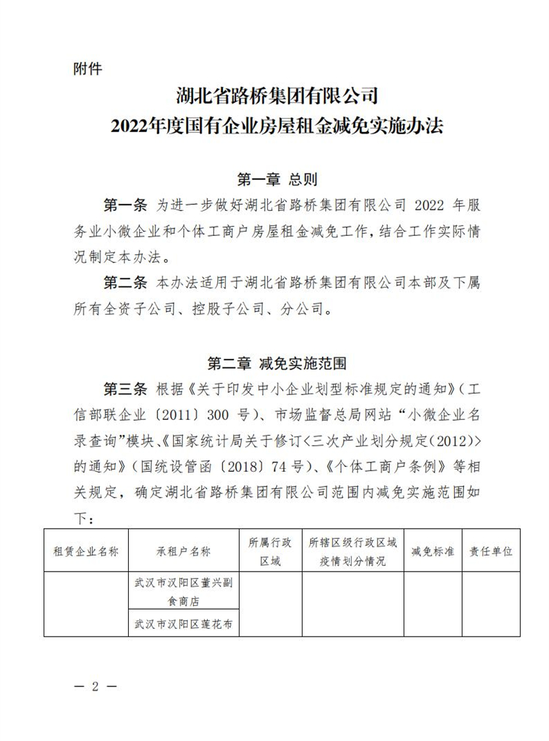 關于印發《湖北省路橋集團有限公司2022年度國有企業房屋租金減免實施辦法》的通知