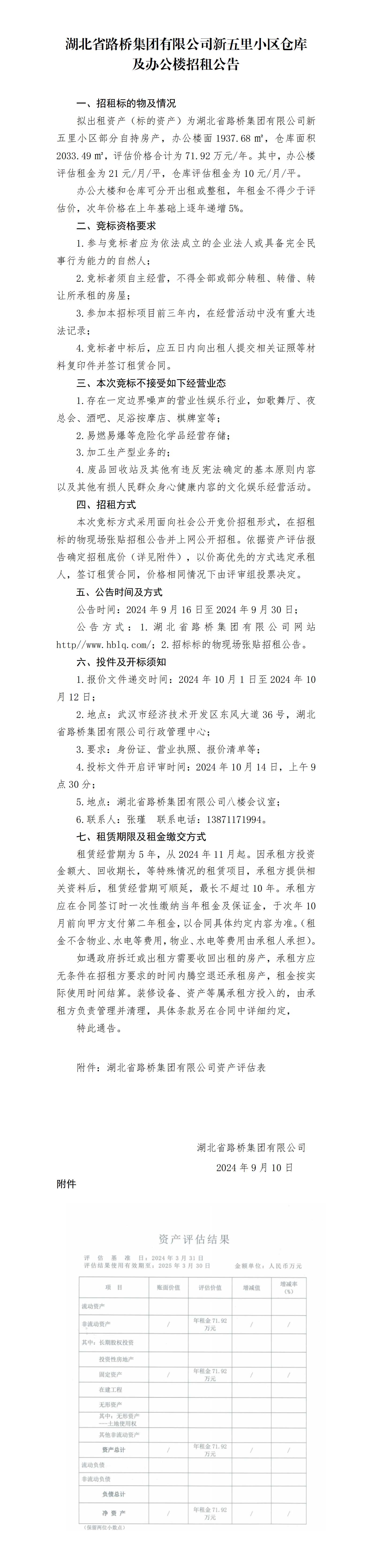 湖北省路橋集團有限公司新五里小區倉庫及辦公樓招租公告